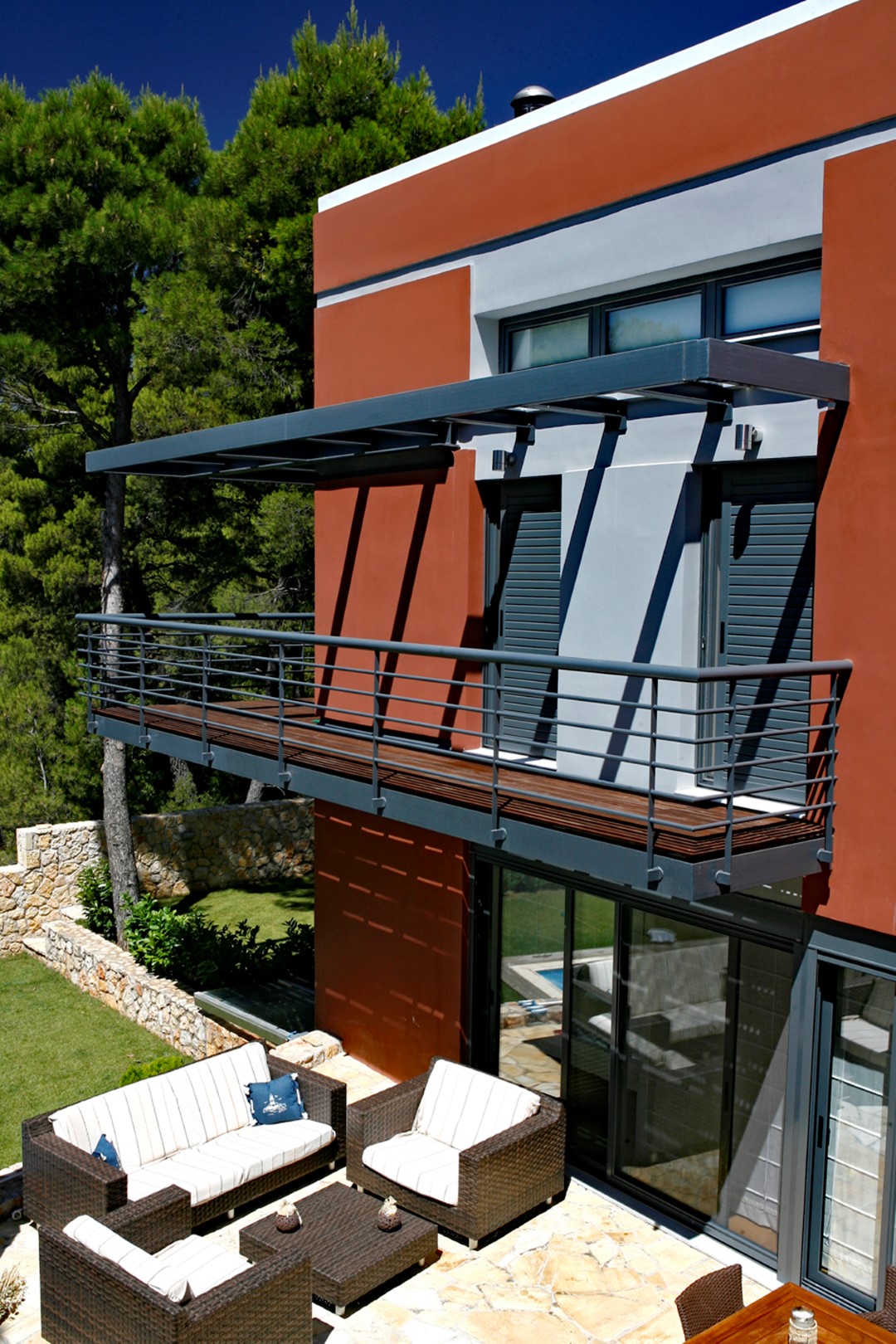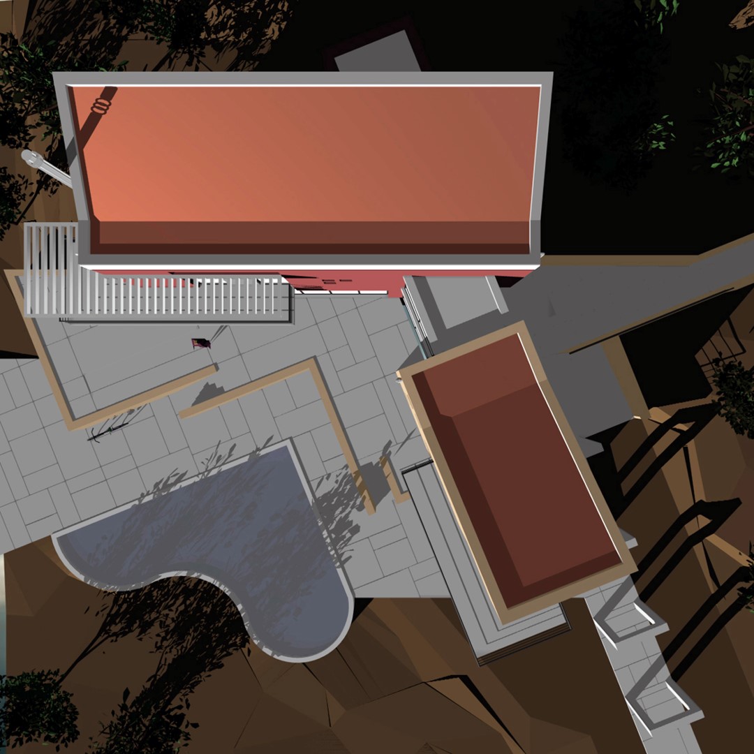 Η κάτοψη χαράσσεται ως «L» και είναι προσανατολισμένη νοτιοανατολικά. Η πτέρυγα που αναπτύσσεται παράλληλα με τις υψομετρικές καμπύλες, λειτουργεί και ως ένα είδος τοίχου αντιστήριξης, ενώ η πτέρυγα που αναπτύσσεται κάθετα προς αυτές, αντιμετωπίζεται ως όγκος που αποκολλάται από το έδαφος και που λόγω θέσης και λειτουργιών που φιλοξενεί, προσφέρει πολλαπλές οπτικές.