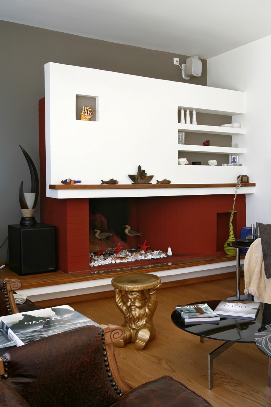Στο σημείο τομής των δύο πτερύγων, οργανώνεται η είσοδος, διαμπερής χώρος με διπλό ύψος στο οποίο προσδίδεται διαφάνεια. Από το χώρο αυτό διαβάζονται όλες οι λειτουργικές ενότητες της κατοικίας και διανέμονται οι κινήσεις προς αυτές με τρόπο ορθολογικό.